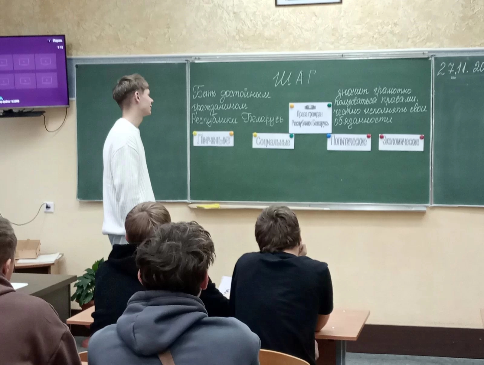27 ноября 2025 года в учебных группах колледжа в рамках информационно-образовательного проекта «ШАГ» - «Школа Активного Гражданина» был проведен информационный час на тему «Быть достойным гражданином Республики Беларусь – значит грамотно пользоваться своими правами, честно и добросовестно исполнять свои обязанности».