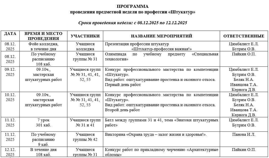 В соответствии с годовым планом работы колледжа с 17.11.2025 по 21.11.2025 будет проходить предметная неделя