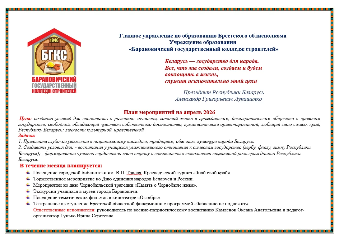 31 марта 2026 года в учебных группах колледжа в рамках информационно-образовательного проекта «ШАГ» - «Школа Активного Гражданина» был проведен информационный час на тему «Быть достойным гражданином Республики Беларусь – значит разделять и поддерживать духовные ценности белорусского общества». В фокусе обсуждения стали следующие понятия: духовные ценности белорусского народа, историко-культурное наследие Беларуси, важность сохранения исторической памяти, семейные ценности белорусов, экологическая ответственность гражданина Беларуси.
