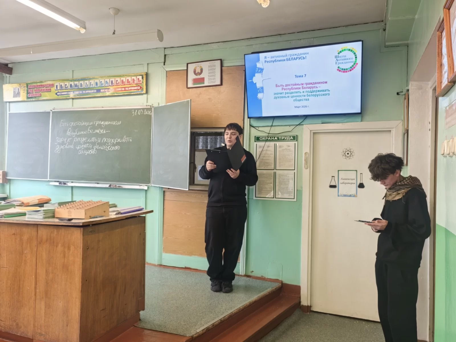 31 марта 2026 года в учебных группах колледжа в рамках информационно-образовательного проекта «ШАГ» - «Школа Активного Гражданина» был проведен информационный час на тему «Быть достойным гражданином Республики Беларусь – значит разделять и поддерживать духовные ценности белорусского общества». В фокусе обсуждения стали следующие понятия: духовные ценности белорусского народа, историко-культурное наследие Беларуси, важность сохранения исторической памяти, семейные ценности белорусов, экологическая ответственность гражданина Беларуси.
