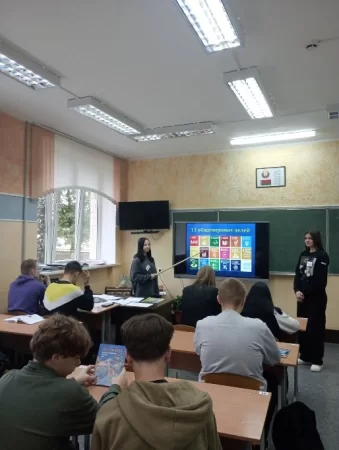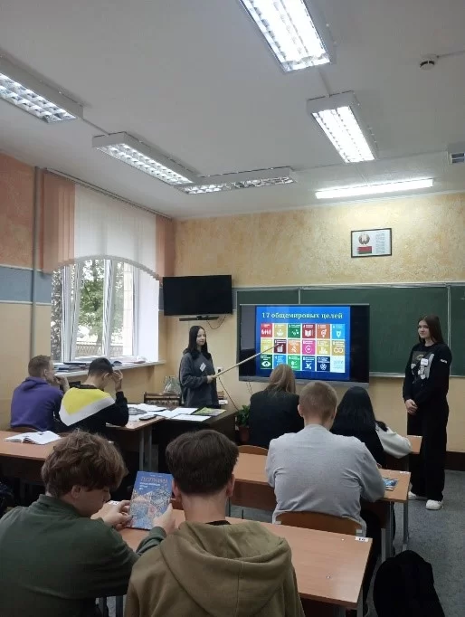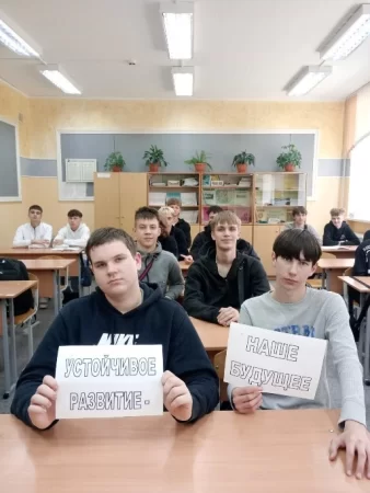 На уроке первокурсники узнали о 17-ти целях устойчивого развития, познакомились с понятием «устойчивое развитие», обсудили проблемы глобального потепления и накопления мусора, говорили о неразумном потреблении.