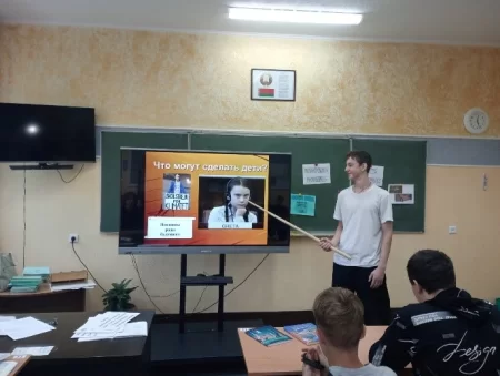 На уроке было продемонстрировано много видеосюжетов, которые заставили задуматься о том, почему так тревожно за судьбу нашей планеты, почему все люди должны сплотиться перед глобальными угрозами, чтобы сохранить нашу прекрасную планету и жизнь на ней. Запомнился ребятам рассказ о Грете Тунберг, шведской школьнице, которая в одиночку стала заявлять о своей позиции в связи с изменением климата и вышла с плакатами на протест. В скором времени экопротест «Пятницы ради будущего» стал общемировым.