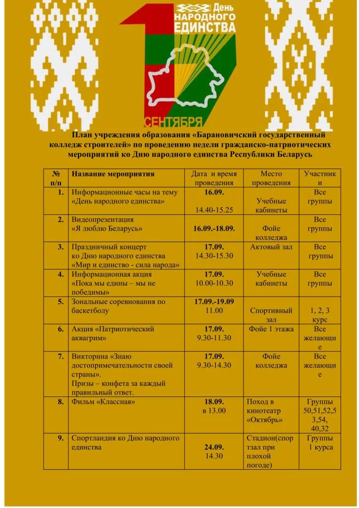 17 сентября в колледже была проведена акция «17 вопросов к 17 сентября», посвященная Дню народного единства Республики Беларусь. У обучающихся колледжа была не только уникальная возможность проверить себя на знание достопримечательностей родной страны, но и стать обладателем сладких призов. Так же все участники интеллектуального конкурса были награждены патриотическим аквагримом от активистов ОО «БРСМ».