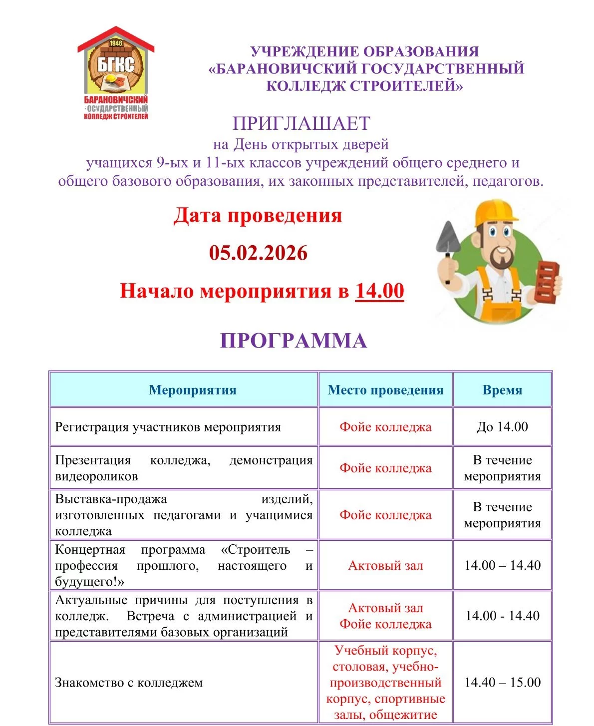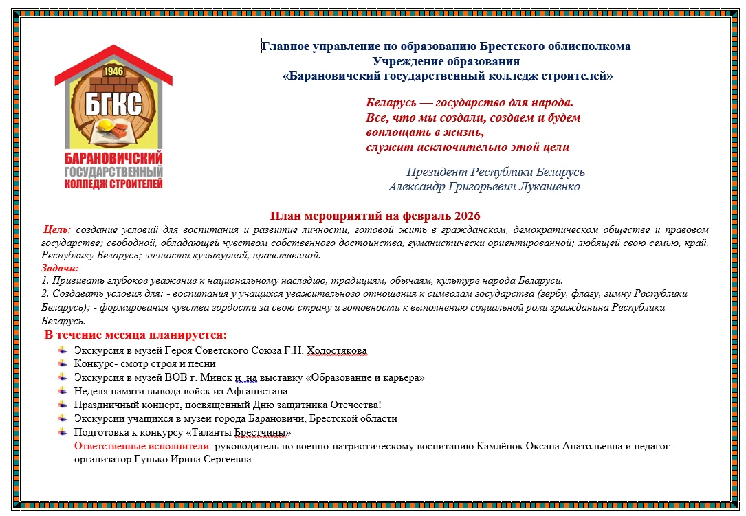 УЧРЕЖДЕНИЕ ОБРАЗОВАНИЯ "БАРАНОВИЧСКИЙ ГОСУДАРСТВЕННЫЙ КОЛЛЕДЖ СТРОИТЕЛЕЙ"
